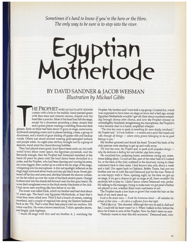 EGYPTIAN MOTHERLODE is a novel about a central, mysterious figure–the Prophet, a funk musician with strange powers related to his music.